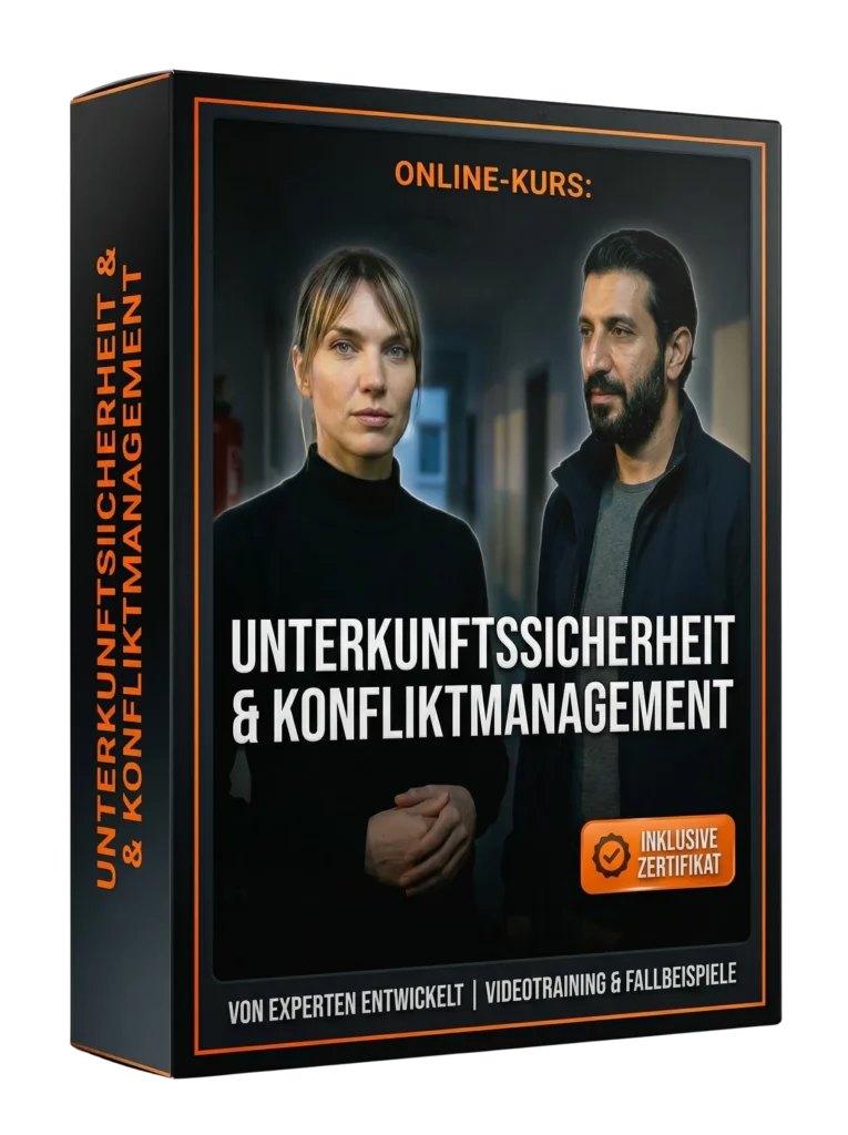 Die Spezialisierungsschulung für Sicherheitskräfte in Asyl- und Gemeinschaftsunterkünften. Dieser Kurs vermittelt interkulturelle Kompetenz, professionelles Konfliktmanagement und den rechtssicheren Umgang mit psychisch labilen Bewohnern – für ein sicheres Umfeld und einen respektvollen Alltag.